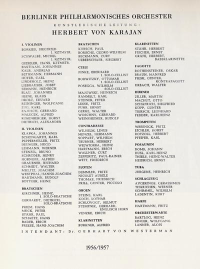 I:Orchesterverzeichnisse seit 1882に掲載されている1956/1957シーズンのベルリン・フィルハーモニー管弦楽団のメンバー表です。