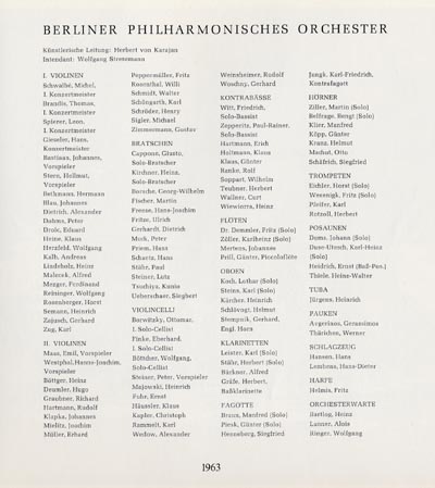 I:Orchesterverzeichnisse seit 1882に掲載されている1963のベルリン・フィルハーモニー管弦楽団のメンバー表です。