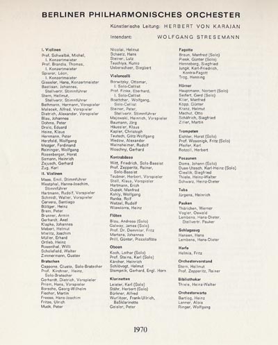 I:Orchesterverzeichnisse seit 1882に掲載されている1970のベルリン・フィルハーモニー管弦楽団のメンバー表です。
