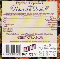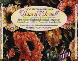Rec:1954.12.10.ミラノ・ライヴ(放送用録音) ミラノ・ヴェルディ音楽院大ホール、ミラノ RAIミラノ管弦楽団 RAIミラノ合唱団 ローランド・パネライ(Br:父親ペーター) ブルーナ・ロンチーニ(A:母親ゲルトルート) ゼーナ・ユリナック(S:ヘンゼル) エリーザベト・シュヴァルツコップ(S:グレーテル) ヴィットリア・パロンビーニ(A:魔女) リタ・シュトライヒ(S:眠り精) ルイーザ・ヴィッラ(S:暁の精) ヘルベルト・フォン・カラヤン指揮 CD:DATUM,DAT 12314-2(ディスクのケース表) (1954.12.10.のクレジット) (ジャケット画像は東京のS氏にご提供いただきました。2007.9.21.)