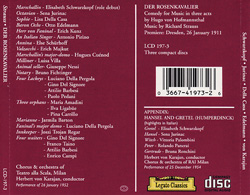 Legato,LCD197-3(部分) (ディスクのケース裏) (-)1954.12.25.RAI-Milano/Haensel und Gretel Programme)E.Humperdinck:Haensel und Gretel Teatro alla Scala,Mailand RAI Orchester-Mailand(Orchester) RAI Chor-Mailand(Chor) Roland Panerai(Peter) Sena Jurinac(Haensel) Elisabeth Schwarzkopf(Gretel) Vittoria Palombini(Saenger ?) Rita Streich(Die Knusperhexe) Herbert von Karajan(Dirigent) (KC3、pa2に記録なし、OM巻末p150−ミラノ・スカラ座管弦楽団の記録だが、最新未刊行データでは変更) (KI1、KL解説書-記録なし) *KARAJAN CENTRUMには1954年12月25日の演奏会記録がある。会場はスカラ座。 *Hunt,pa2,p105によると、1954年2月6日収録して1954年12月25日にラジオ放送された。 *OM編者最新(未刊行)データによると1954年12月10日収録、放送は1954年12月25日。 会場はスカラ座ではなく、ミラノ・ヴェルディ音楽院大ホール (Milano,Sala Grande del Concervatore G.Verdi) 1955/1956から1958/1959シーズンに演奏会で取り上げていない
