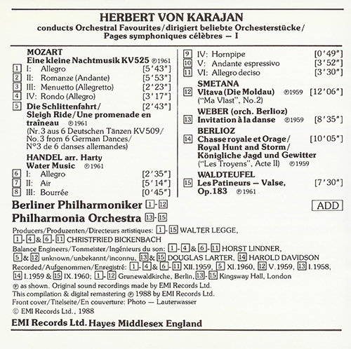 録音:1959年12月30日-31日(「アイネ・クライネ・ナハトムジーク」、「水上の音楽」)グリュンネヴァルト教会、ベルリン