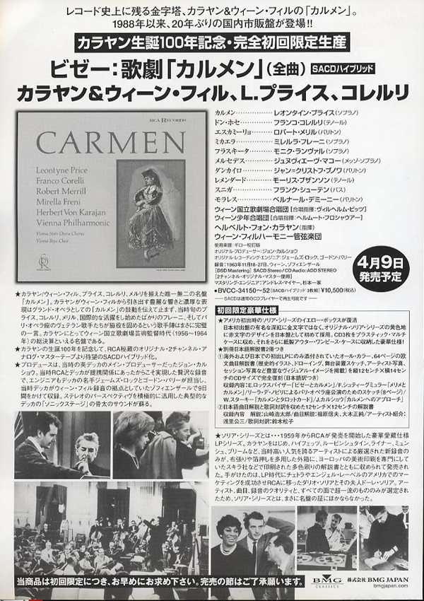 レコード史上に残る金字塔、カラヤン&ウィーン・フィルの「カルメン」。 1988年以来、20年ぶりの国内市販盤が登場!!