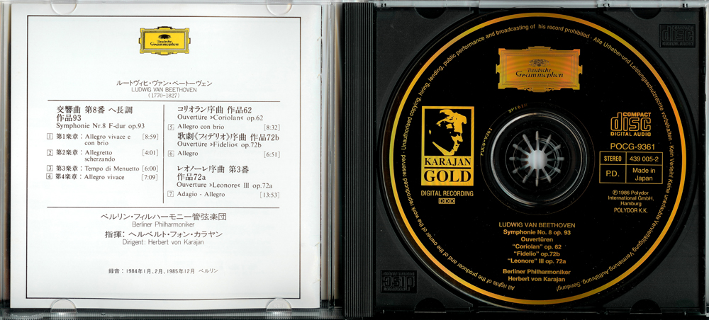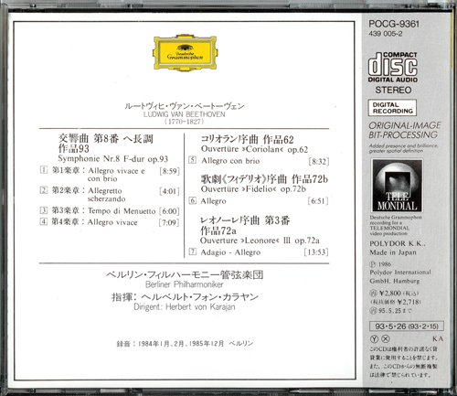 POCG-9361 ベートーヴェン:交響曲第8番、歌劇「フィデリオ」序曲、「レオノーレ」序曲第3番、序曲「コリオラン」