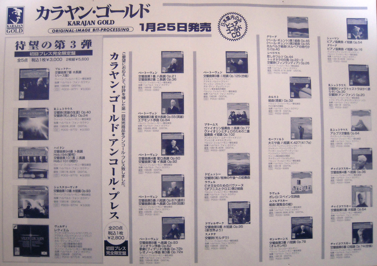 *第3弾のカラヤン・ゴールド全5点がリリースされた時に、同時に第1回発売のカラヤン・ゴールド全20点がアンコール・プレスされた。