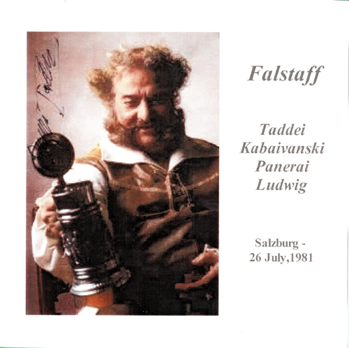 1981年7月26日ザルツブルク音楽祭(ヴェルディ:歌劇「ファルスタッフ」) を収録したディスクRec:1981.7.26.ザルツブルク音楽祭ライヴ 祝祭大劇場、ザルツブルク ウィーン・フィルハーモニー管弦楽団 ウィーン国立歌劇場合唱団 ジュゼッペ・タディ(Br:ファルスタッフ) ライナ・カヴァイヴァンスカ(S:フォード夫人) ジャネット・ペリー(S:ナネッタ) トゥルデリーゼ・シュミット(Ms:ペイジ夫人) クリスタ・ルートヴィヒ(Ms:クイックリー夫人) フランシスコ・アライサ(T:フェントン) ピエロ・デ・パルマ(T:カイウス) ハインツ・ツェドニク(T:バルドルフィ) ロランド・パネライ(Br:フォード) フィデリコ・ダヴィア(Bs:ビストーラ) アレクサンダー・シュナイダー=ジームセン(ロビン) ワルター・ハーゲン=グロル(合唱指揮) ヘルベルト・フォン・カラヤン指揮 CD-R: The Opera Lovers, FAL-198101 ジャケットにタイミングの表示なし CD 1: 第1幕(track1 - track6)、第2幕(track7 - track11) Act 1 track1. Falstaff! Ola! track2. Spendo ogni sette giorni... track3. L'onore! Ladri! track4. Alice, Meg...Nanetta... track5. Labbra di fuoco! track6. Udrai quanta egli sfoggia... Act 2 track7. Siam pentiti e contriti track8. Reverenza; se Vostra Grazia... track9. Alice e mia! Va, vecchio John... track10. Io l'amo e lei non m'ama... track11. E sogno? o realta... CD 2: 第2幕(track1 - track4)、第3幕(track5 - track11) Act 2 track1. Presenteremo un billetto... track2. Bravissima! cosi... track3. Alfin t'ho colto... track4. Seguimi...adagio... Act 3 track5. Ehi! Taverniere!...Mondo ladro... track6. Al diavole te... track7. Dal labbro il canto... track8. Una, due, tre... track9. Alto la! Chi va la? track10. Naso vermiglio! track11. Tutto nel mondo e burla...