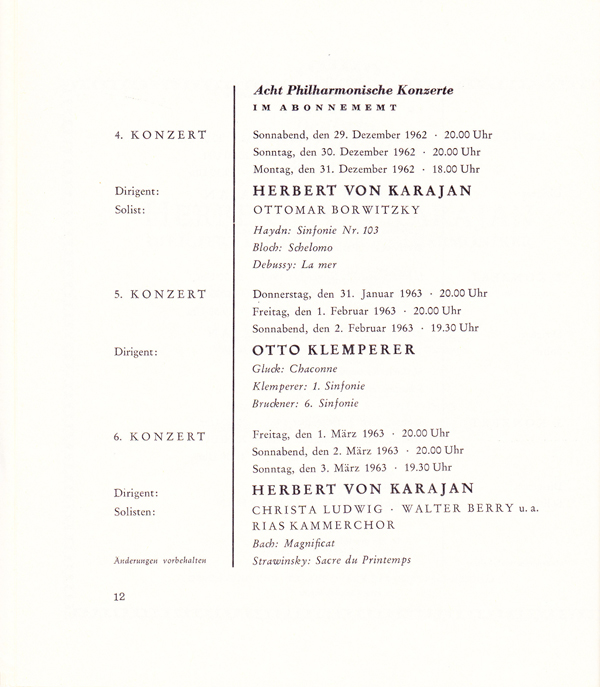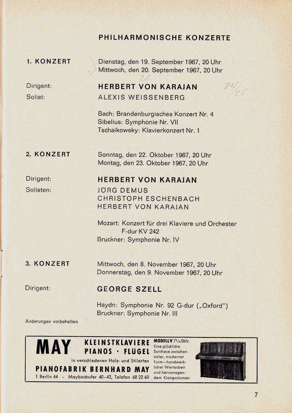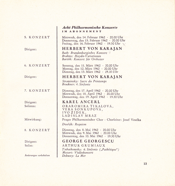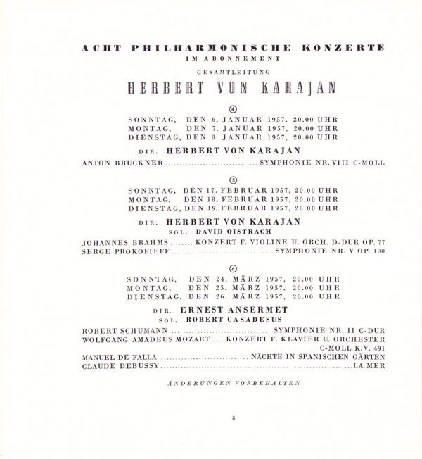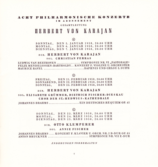 7. Konzertが1957年4月28日、29日、30日の予定から変更されて1957年5月24日、25日、26日(午後8時)に行われることが記述されています。