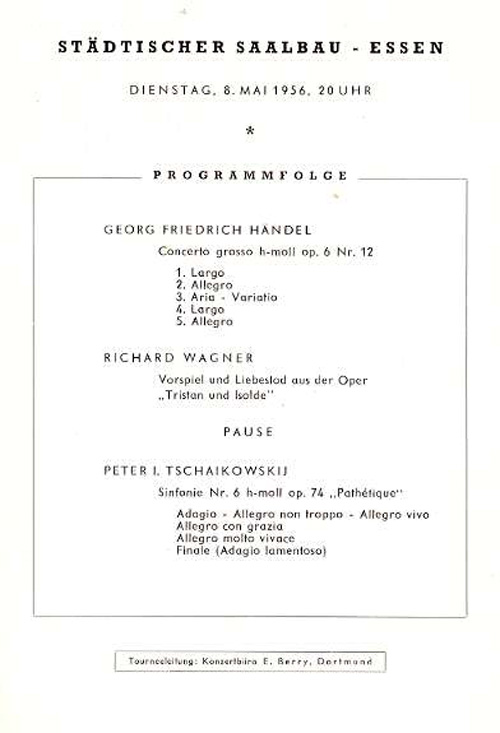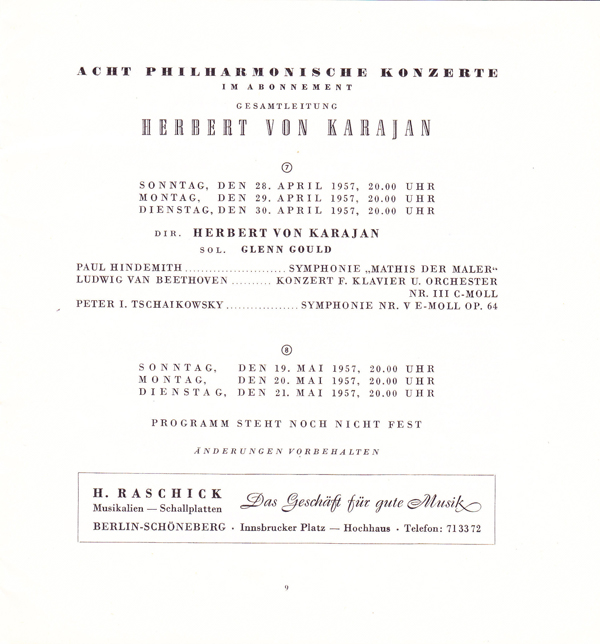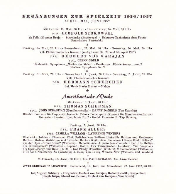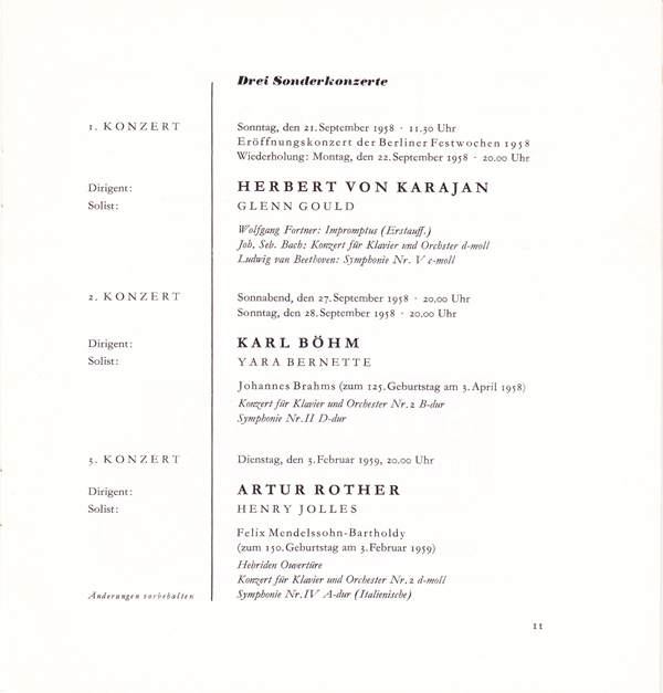 1958年9月21日(11時30分)、22日(午後8時)にフォルトナーの管弦楽のための即興曲、バッハのピアノ協奏曲第1番BWV1052(グールドのピアノ)、ベートーヴェンの交響曲第5番が予定されました。
