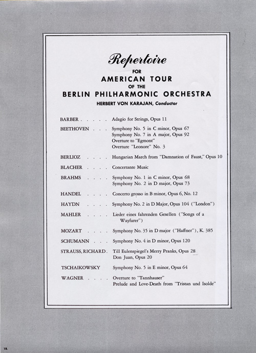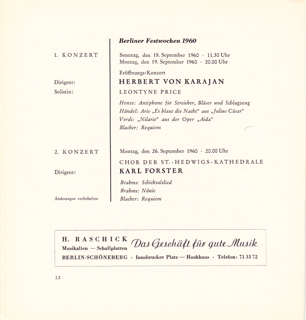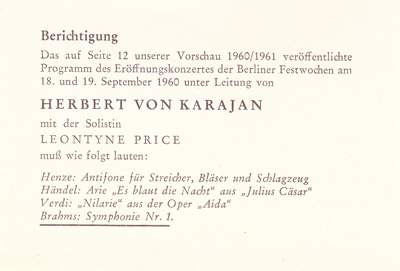 1960年9月18日(午前11時30分)、19日(午後8時)にヘンツェのアンティゴーニ、ヘンデルの歌劇「ジュリアス・シーザー」〜「2つの瞳よ、御身らが慕わしい」(レオンタイン・プライスのソプラノ)、ヴェルディの歌劇「アイーダ」〜第3幕「おお、私の故郷よ」(レオンタイン・プライスのソプラノ)、ブラッヒャーのレクイエムが予定されました。