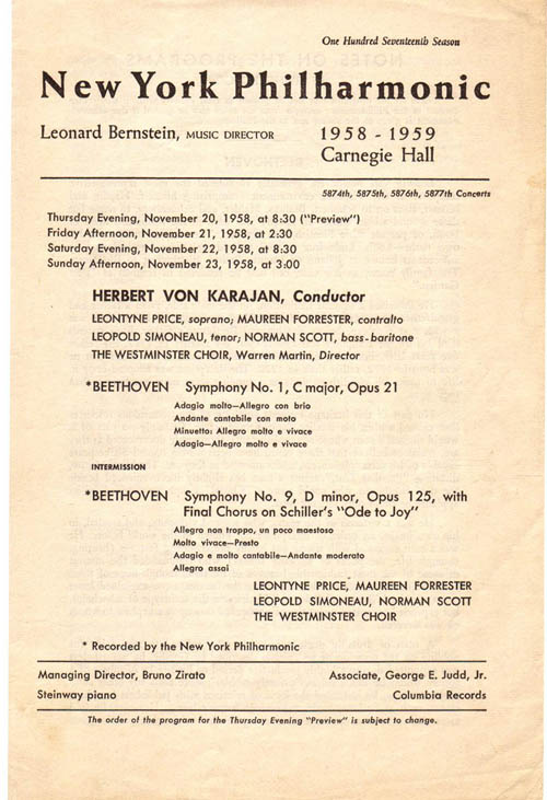 8:30-10:30-Concer: New York Philharmonic Orchestra, with Herbert von Karajan conducting; Leontyne Price,soprano; Maureen Forrester,contralto; Leopold Simoneau,tenor; Norman Scott,bass. Warren Martin directs the Wesminster Chor. Beethoven's Symphony No.1 and Symphony No.9(Choral)-(WCBS)