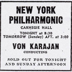 カーネギー・ホールで今夜8:30と明日(日曜日)午後3:00にカラヤン指揮で行う演奏会。