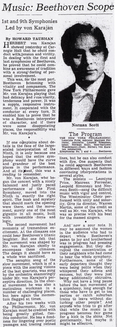 27面に掲載されているカラヤン/NYPの演奏会記事(Howard Taubman著)