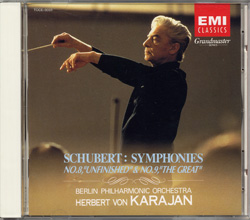 CD:EMI,TOCE-56185(2009.2.11.リリース) [カラヤン プレミアム2CDシリーズ 3] CD1 交響曲第5番変ロ長調 D.485 交響曲第6番ハ長調 D.589 「ロザムンデ」序曲 D.797 CD2 交響曲第7番(第8番)ロ短調 D.759「未完成」 交響曲第8番(第9番)ハ長調 D.944「グレート」