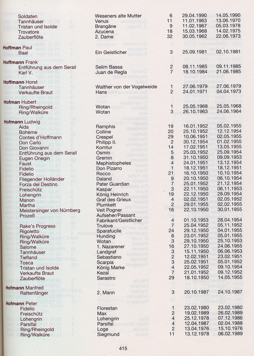 1958/1959:このシーズンに ベートーヴェンの歌劇「フィデリオ」 ヴェルディの歌劇「トスカ」、歌劇「オテロ」、歌劇「アイーダ」 ビゼーの歌劇「カルメン」ワーグナーの楽劇「ワルキューレ」、楽劇「ジークフリート」、楽劇「ラインの黄金」、 楽劇「トリスタンとイゾルデ」、楽劇「ニュルンベルクのマイスタージンガー」 モーツアルトの歌劇「フィガロの結婚」 プッチーニの歌劇「マダム・バタフライ」 が上演された。 L.v.Beethoven:Fidelio (68)1958.10.11.Wiener Staatsopernorchester/Fidelio Programme)L.v.Beethoven:Fidelio Staatsoper,Wien G.Verdi:Tosca (69)1958.10.13.Wiener Staatsopernorchester/Tosca Programme)G.Verdi:Tosca Staatsoper,Wien (70)1959.6.12.Wiener Staatsopernorchester/Tosca Programme)G.Verdi:Tosca Staatsoper,Wien (71)1959.9.9.Wiener Staatsopernorchester/Tosca Programme)G.Verdi:Tosca Staatsoper,Wien R.Wagner:Der Ring des Nieberungen 3/Siegfried (72)1958.10.15.Wiener Staatsopernorchester/Siegfried-Premiere Programme)R.Wagner:Der Ring des Nieberungen 3/Siegfried Staatsoper,Wien (73)1958.12.21.Wiener Staatsopernorchester/Siegfried Programme)R.Wagner:Der Ring des Nieberungen 3/Siegfried Staatsoper,Wien (74)1959.4.8.Wiener Staatsopernorchester/Siegfried Programme)R.Wagner:Der Ring des Nieberungen 3/Siegfried Staatsoper,Wien (75)1959.5.31.Wiener Staatsopernorchester/Siegfried Programme)R.Wagner:Der Ring des Nieberungen 3/Siegfried Staatsoper,Wien G.Verdi:Otello (76)1958.12.2.Wiener Staatsopernorchester/Otello Programme)G.Verdi:Otello Staatsoper,Wien (77)1958.12.5.Wiener Staatsopernorchester/Otello Programme)G.Verdi:Otello Staatsoper,Wien (78)1959.3.10.Wiener Staatsopernorchester/Otello Programme)G.Verdi:Otello Staatsoper,Wien (79)1959.6.15.Wiener Staatsopernorchester/Otello Programme)G.Verdi:Otello Staatsoper,Wien R.Wagner:Der Ring des Nieberungen 2/Die Walkuere (80)1958.12.14.Wiener Staatsopernorchester/Die Walkuere Programme)R.Wagner:Der Ring des Nieberungen 2/Die Walkuere Staatsoper,Wien (81)1959.3.30.Wiener Staatsopernorchester/Die Walkuere Programme)R.Wagner:Der Ring des Nieberungen 2/Die Walkuere Staatsoper,Wien (82)1959.5.28.Wiener Staatsopernorchester/Die Walkuere Programme)R.Wagner:Der Ring des Nieberungen 2/Die Walkuere Staatsoper,Wien R.Wagner:Der Ring des Nieberungen 1/Das Rheingold (83)1958.12.23.Wiener Staatsopernorchester/Das Rheingold-Premiere Programme)R.Wagner:Der Ring des Nieberungen 1/Das Rheingold Staatsoper,Wien (84)1959.1.25.Wiener Staatsopernorchester/Das Rheingold Programme)R.Wagner:Der Ring des Nieberungen 1/Das Rheingold Staatsoper,Wien (85)1959.3.29.Wiener Staatsopernorchester/Das Rheingold Programme)R.Wagner:Der Ring des Nieberungen 1/Das Rheingold Staatsoper,Wien (86)1959.4.5.Wiener Staatsopernorchester/Das Rheingold Programme)R.Wagner:Der Ring des Nieberungen 1/Das Rheingold Staatsoper,Wien (87)1959.5.26.Wiener Staatsopernorchester/Das Rheingold Programme)R.Wagner:Der Ring des Nieberungen 1/Das Rheingold Staatsoper,Wien W.A.Mozart:Die Hochzeit des Figaro (88)1959.1.27.Wiener Staatsopernorchester/Die Hochzeit des Figaro Programme)W.A.Mozart:Die Hochzeit des Figaro Staatsoper,Wien (89)1959.1.31.Wiener Staatsopernorchester/Die Hochzeit des Figaro Programme)W.A.Mozart:Die Hochzeit des Figaro Staatsoper,Wien (90)1959.1.27.Wiener Staatsopernorchester/Die Hochzeit des Figaro-Galavorstellung fuer den XV. Kongress der Int. Verleger-UNion in Wien! Programme)W.A.Mozart:Die Hochzeit des Figaro Staatsoper,Wien (91)1959.6.7.Wiener Staatsopernorchester/Die Hochzeit des Figaro Programme)W.A.Mozart:Die Hochzeit des Figaro Staatsoper,Wien (92)1959.9.3.Wiener Staatsopernorchester/Die Hochzeit des Figaro Programme)W.A.Mozart:Die Hochzeit des Figaro Staatsoper,Wien G.Puccini:Madame Butterfly (93)1959.2.2.Wiener Staatsopernorchester/Madame Butterfly Programme)G.Puccini:Madame Butterfly Staatsoper,Wien G.Bizet:Carmen (94)1959.6.8.Wiener Staatsopernorchester/Carmen Programme)G.Bizet:Carmen Staatsoper,Wien R.Wagner:Tristan und Isolde (95)1959.6.14.Wiener Staatsopernorchester/Tristan und Isolde-Premiere Programme)R.Wagner:Tristan und Isolde Staatsoper,Wien (96)1959.6.18.Wiener Staatsopernorchester/Tristan und Isolde Programme)R.Wagner:Tristan und Isolde Staatsoper,Wien (97)1959.9.12.Wiener Staatsopernorchester/Tristan und Isolde Programme)R.Wagner:Tristan und Isolde Staatsoper,Wien G.Verdi:Aida (98)1959.6.22.Wiener Staatsopernorchester/Aida Programme)G.Verdi:Aida Staatsoper,Wien (99)1959.9.13.Wiener Staatsopernorchester/Aida Programme)G.Verdi:Aida Staatsoper,Wien R.Wagner:Die Meistersinger von Nuernberg (100)1959.9.1.Wiener Staatsopernorchester/Die Meistersinger von Nuernberg Programme)R.Wagner:Die Meistersinger von Nuernberg Staatsoper,Wien 1959/1960シーズン